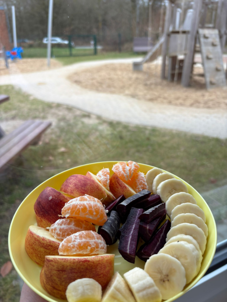 Seit einigen Schuljahren schon, bekommen wir zwei Mal wöchentlich großartige Obst- und Gemüsekisten, alles in Bioqualität. Wir bilden uns so täglich fort, lernen unterschiedliche Obst- und Gemüsesorten im Jahreslauf und ihre Geschmäcker kennen und manchmal auch lieben (Karotten gibt es auch in lila!).